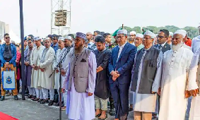 From early morning, mourners arrived in groups at Manik Mia Avenue to pay their final tributes to Hadi, some draped in the national flag. In contrast, others chanted slogans demanding justice for Hadi’s killing.
